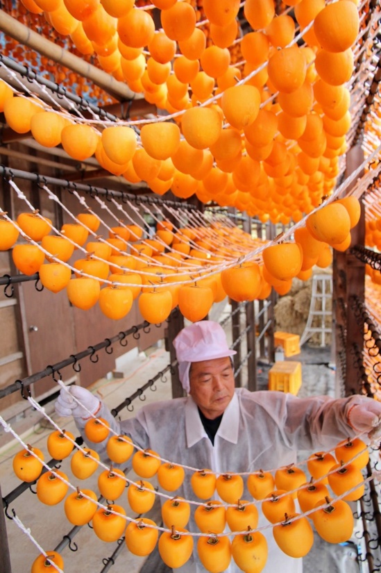Japan uses hachiya, a particular variety of persimmon, which is peeled and left to air dry for over a month. Unlike in China and Korea, in Japan the persimmon is massaged during certain stages of the drying process, giving it a unique shape and texture.